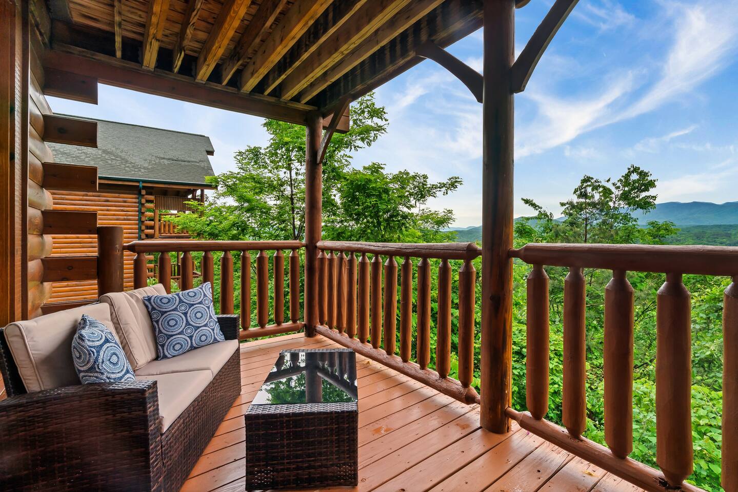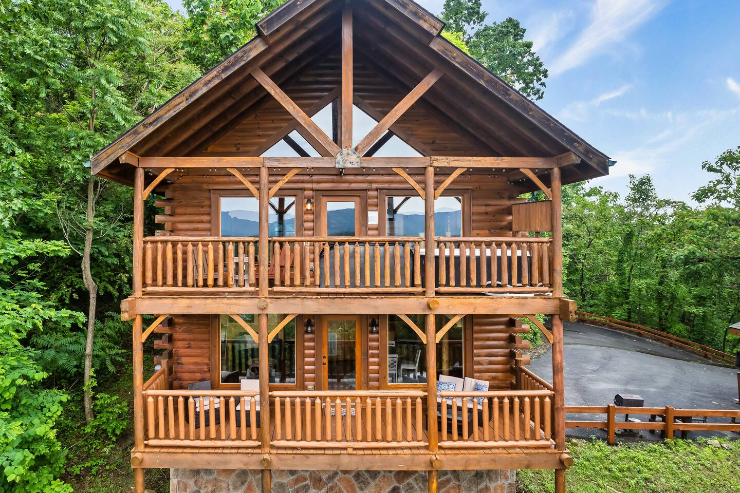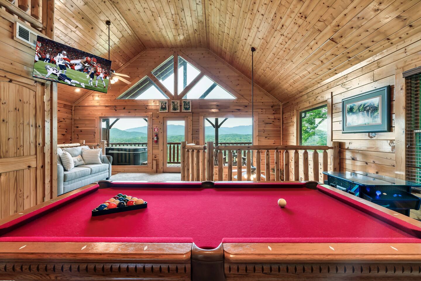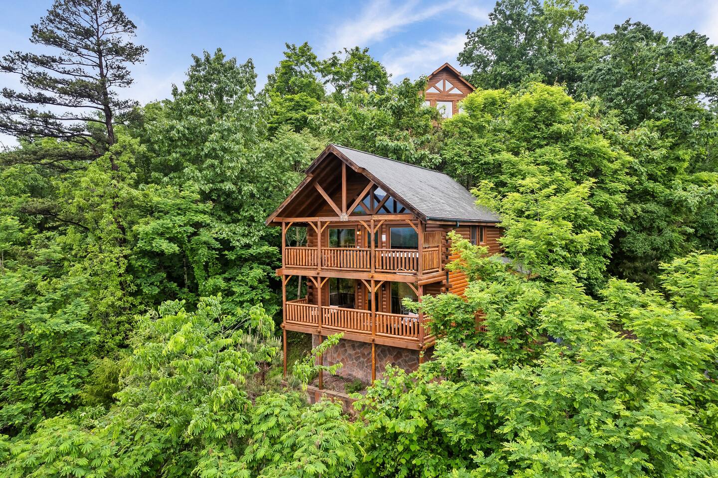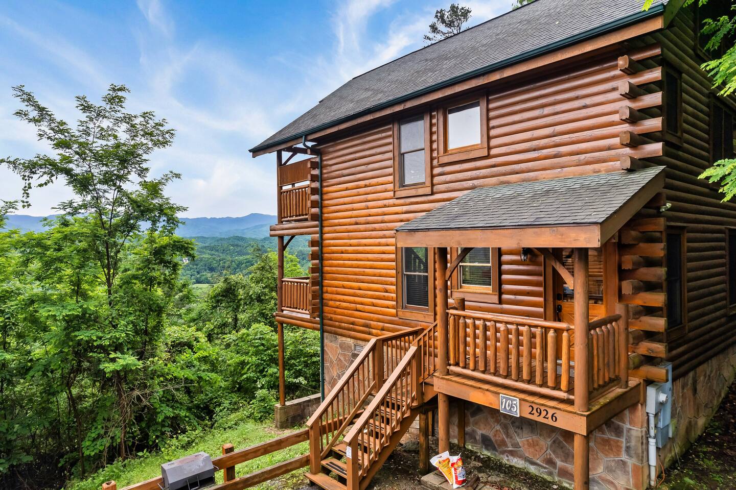 Make your way inside the idyllic log cabin using the keyless smart lock and be greeted with two levels of modern Smokey Mountain style and design perfect for couples, small families or for a romantic getaway. The living space features a bright open-plan layout and is filled with soft leather sofas that surround the inviting fireplace and wall mounted TV – perfect for a movie night in. Open up the glass door off the living space and step out onto your own private balcony where you can sit and enjoy your morning coffee, do a morning yoga session or just breathe in the fresh mountain air. Step through into the galley style kitchen that comes fully equipped with everything you could need to cook up breakfast, lunch and dinner with sleek stone benchtops and stainless steel appliances. There is a full-size fridge/freezer, a freestanding oven and cooktop, a microwave, coffee maker and a dishwasher to take care of all the cleaning up. Eat together at the dining table set for four or if you don’t feel like cooking, head out to the Parkway where you are spoilt for choice with plenty of restaurants, coffee shops and cafes to choose from just 10 minutes away in beautiful Pigeon Forge. Wake surrounded by nature in the luxuriously large king bed topped with soft linen and bedding along with a wall mounted TV and plenty of space for you to unpack and make yourself at home. Off the bedroom is the ensuite bathroom with a relaxing full size bath, an overhead shower and a vanity stocked with all the essentials. Take the stairs up to the second level of the cabin where you will find vaulted ceilings, an additional living space and a spacious games area with a full size pool table and even more awe inspiring views with floor to ceiling windows surrounding the space. Sit by the bar table with a drink or two while you shoot pool with friends or just relax with a book on the sofa in this quiet elevated space. Also on the second level is a full bathroom with a jacuzzi bath, a shower and a vanity stocked with plenty of soft fluffy towels and an additional small sleeper sofa. After a day exploring the Smokies, step out onto the upper deck with its spectacular views and slide into the warm hot tub while it soothes your tired muscles. Included with your stay is full use of the mountain resort amenities. Make your way up to the seasonal pool and cool off in the inviting water in summer then warm up in the sauna and fit in a workout with a fitness center in the clubhouse, it’s like a health retreat right on your doorstep. So if you are looking to enjoy the peace and quiet this private resort provides, look no further than this spacious, modern cabin with beautiful mountain views for your next getaway to Pigeon Forge. We can’t wait to welcome you! 🎉 Our Family is Holiday Friendly. During October [Halloween], November [Thanksgiving], and December [Christmas] you will very likely have decorations. ℹ️ Resort Pool/Pavilion Season is normally Memorial Day through Labor Day, please confirm with us if these amenities are important to your stay as they are not guaranteed.