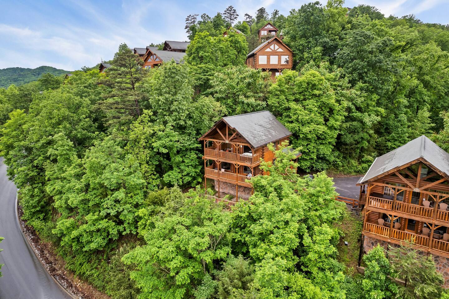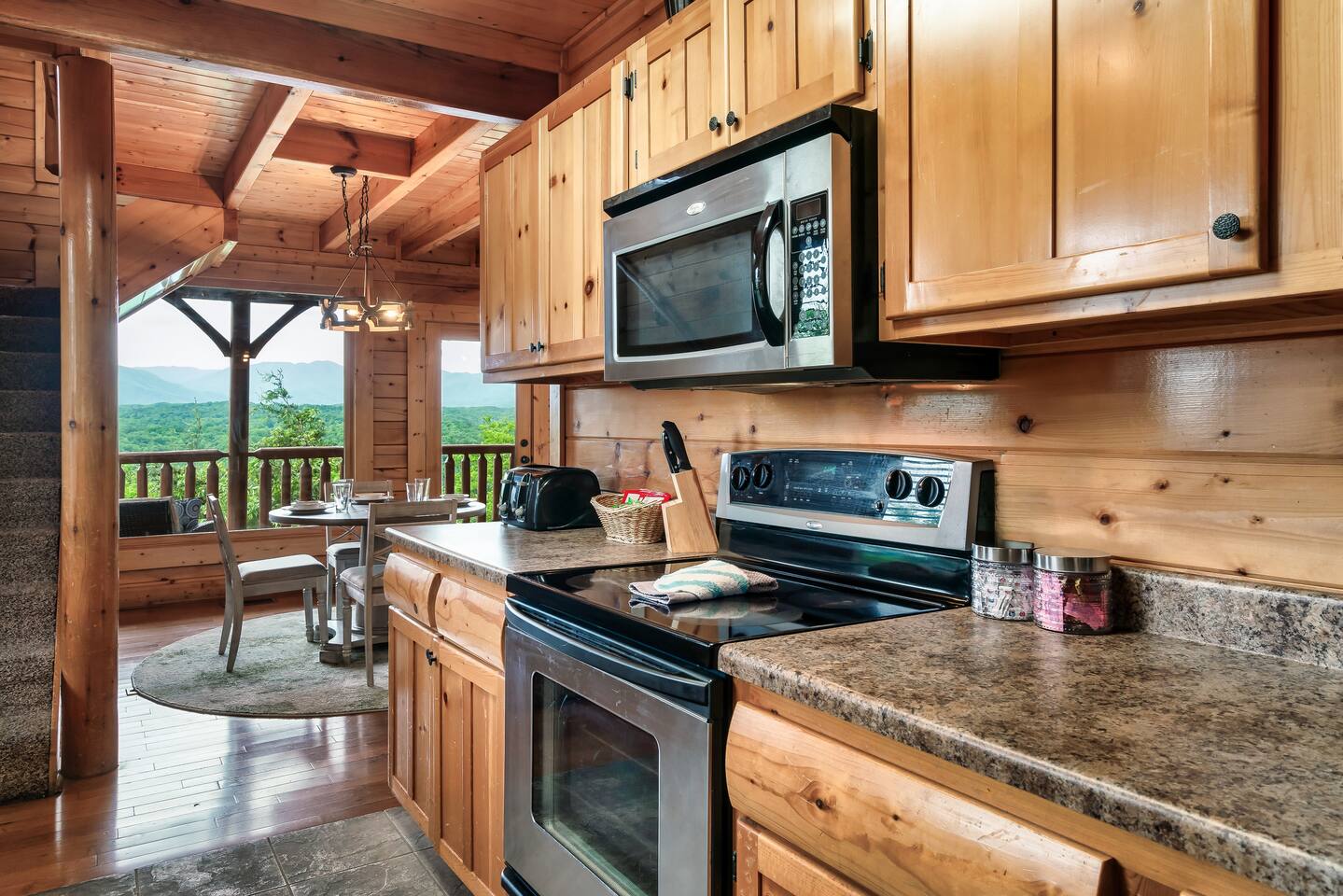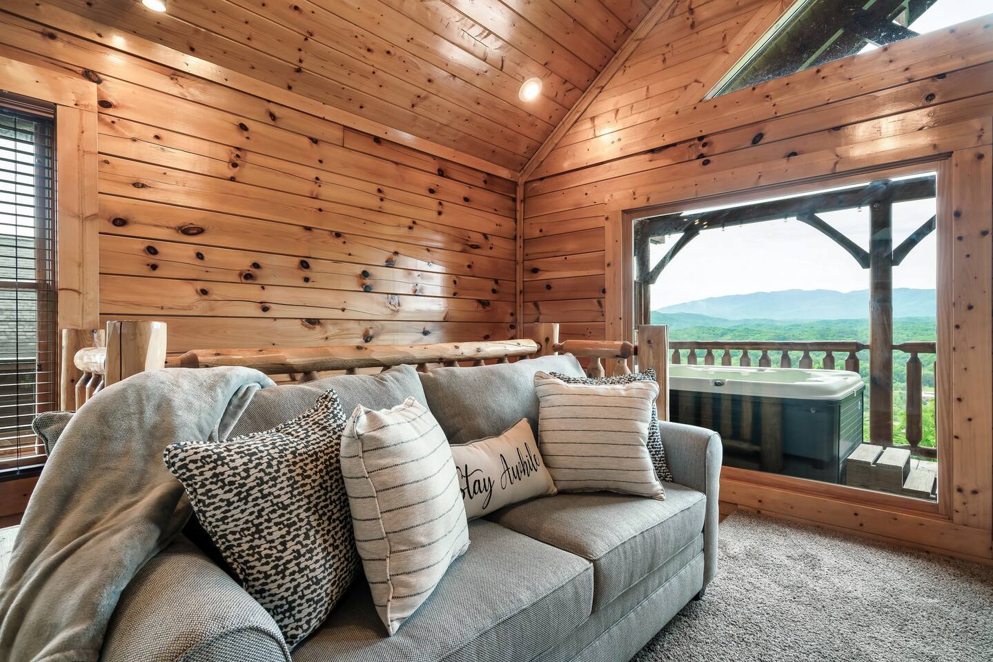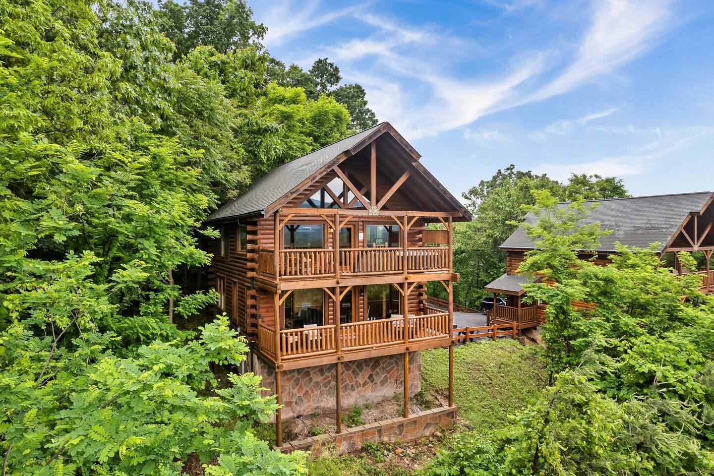 Make your way inside the idyllic log cabin using the keyless smart lock and be greeted with two levels of modern Smokey Mountain style and design perfect for couples, small families or for a romantic getaway. The living space features a bright open-plan layout and is filled with soft leather sofas that surround the inviting fireplace and wall mounted TV – perfect for a movie night in. Open up the glass door off the living space and step out onto your own private balcony where you can sit and enjoy your morning coffee, do a morning yoga session or just breathe in the fresh mountain air. Step through into the galley style kitchen that comes fully equipped with everything you could need to cook up breakfast, lunch and dinner with sleek stone benchtops and stainless steel appliances. There is a full-size fridge/freezer, a freestanding oven and cooktop, a microwave, coffee maker and a dishwasher to take care of all the cleaning up. Eat together at the dining table set for four or if you don’t feel like cooking, head out to the Parkway where you are spoilt for choice with plenty of restaurants, coffee shops and cafes to choose from just 10 minutes away in beautiful Pigeon Forge. Wake surrounded by nature in the luxuriously large king bed topped with soft linen and bedding along with a wall mounted TV and plenty of space for you to unpack and make yourself at home. Off the bedroom is the ensuite bathroom with a relaxing full size bath, an overhead shower and a vanity stocked with all the essentials. Take the stairs up to the second level of the cabin where you will find vaulted ceilings, an additional living space and a spacious games area with a full size pool table and even more awe inspiring views with floor to ceiling windows surrounding the space. Sit by the bar table with a drink or two while you shoot pool with friends or just relax with a book on the sofa in this quiet elevated space. Also on the second level is a full bathroom with a jacuzzi bath, a shower and a vanity stocked with plenty of soft fluffy towels and an additional small sleeper sofa. After a day exploring the Smokies, step out onto the upper deck with its spectacular views and slide into the warm hot tub while it soothes your tired muscles. Included with your stay is full use of the mountain resort amenities. Make your way up to the seasonal pool and cool off in the inviting water in summer then warm up in the sauna and fit in a workout with a fitness center in the clubhouse, it’s like a health retreat right on your doorstep. So if you are looking to enjoy the peace and quiet this private resort provides, look no further than this spacious, modern cabin with beautiful mountain views for your next getaway to Pigeon Forge. We can’t wait to welcome you! 🎉 Our Family is Holiday Friendly. During October [Halloween], November [Thanksgiving], and December [Christmas] you will very likely have decorations. ℹ️ Resort Pool/Pavilion Season is normally Memorial Day through Labor Day, please confirm with us if these amenities are important to your stay as they are not guaranteed.
