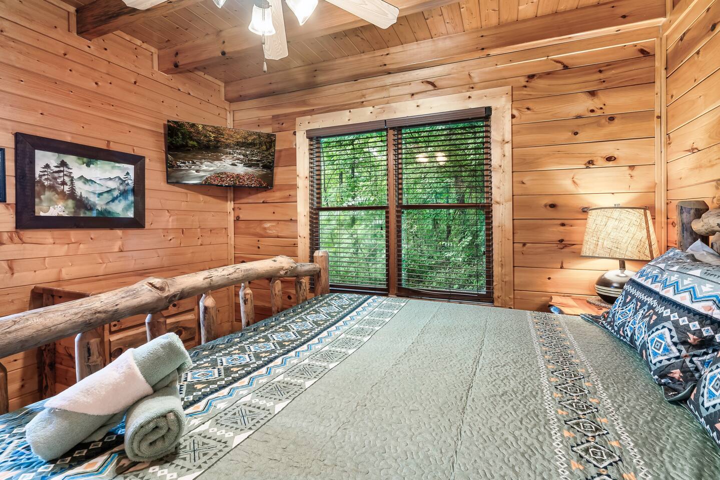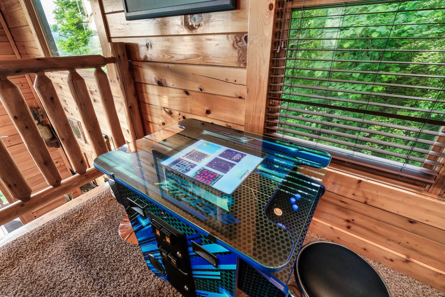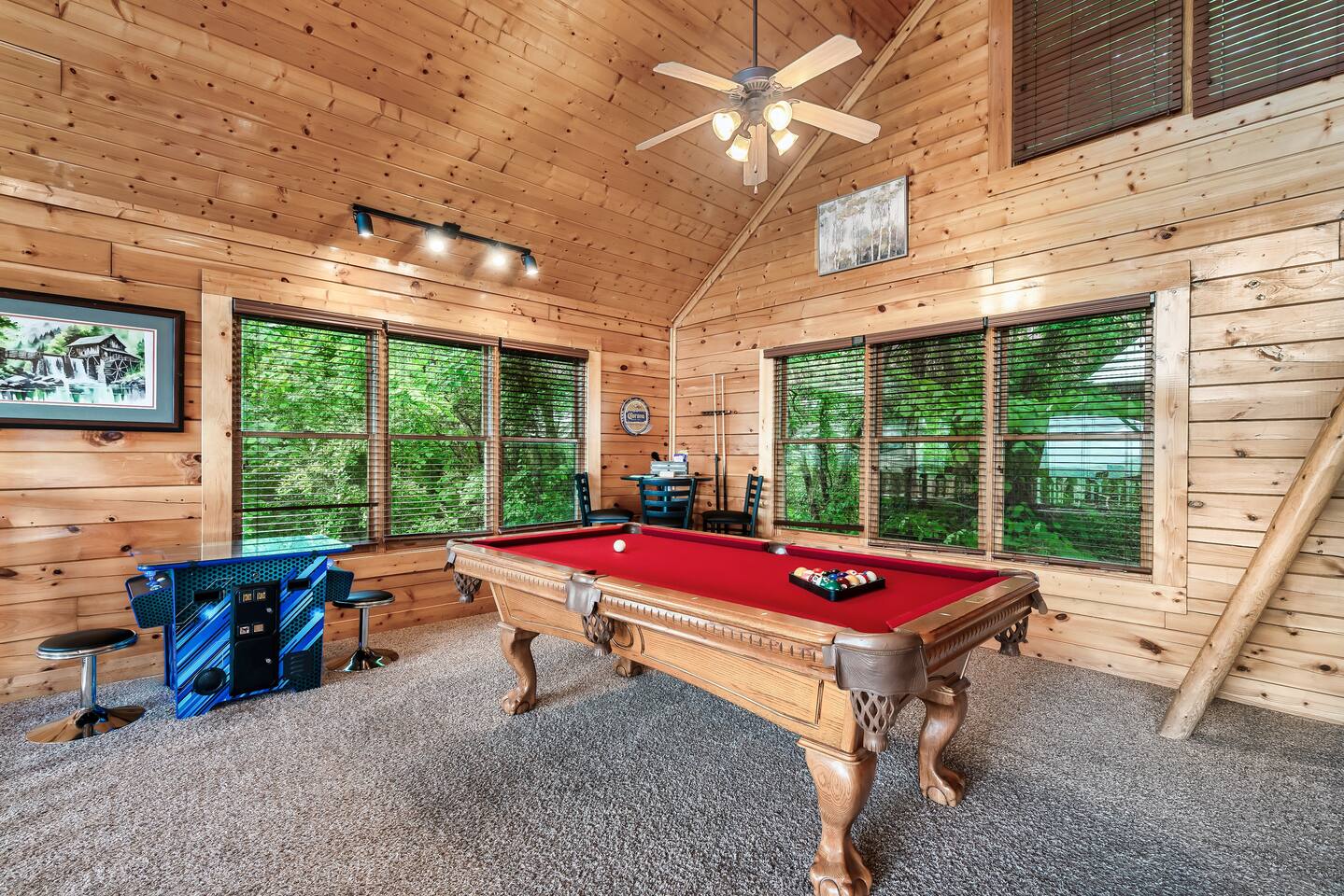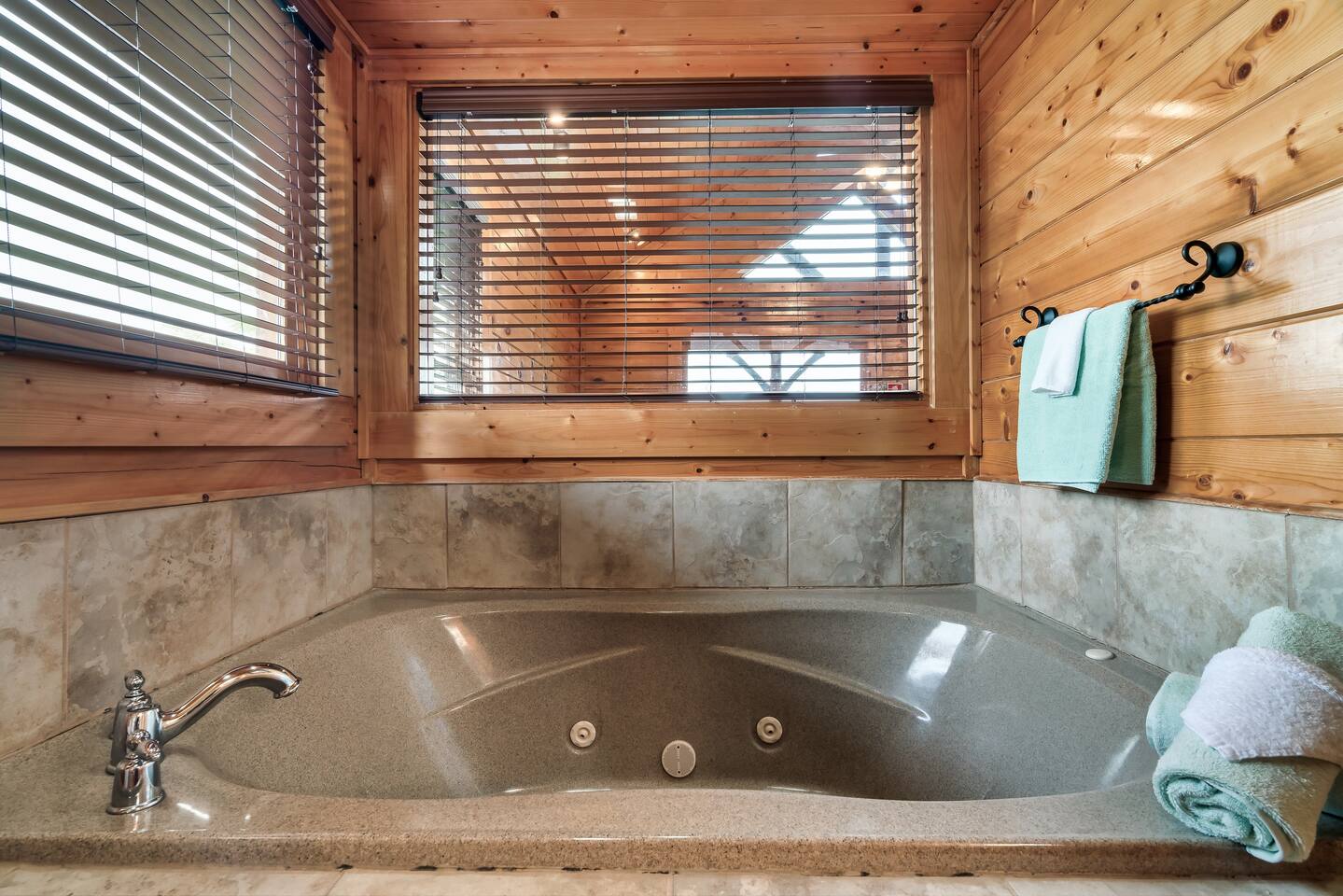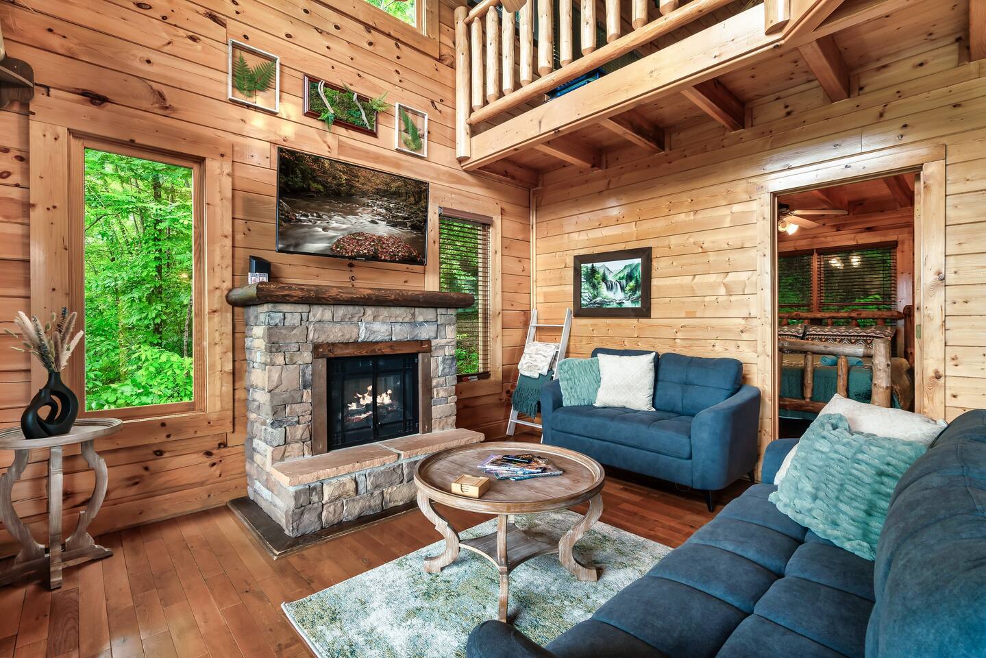 Make your way inside the idyllic log cabin using the keyless smart lock and be greeted with two levels of modern Smokey Mountain style and design perfect for couples, small families or for a romantic getaway. The living space features a bright open-plan layout and is filled with soft leather sofas that surround the inviting fireplace and wall mounted TV – perfect for a movie night in. Open up the glass door off the living space and step out onto your own private balcony where you can sit and enjoy your morning coffee, do a morning yoga session or just breathe in the fresh mountain air. Step through into the galley style kitchen that comes fully equipped with everything you could need to cook up breakfast, lunch and dinner with sleek stone benchtops and stainless steel appliances. There is a full-size fridge/freezer, a freestanding oven and cooktop, a microwave, coffee maker and a dishwasher to take care of all the cleaning up. Eat together at the dining table set for four or if you don’t feel like cooking, head out to the Parkway where you are spoilt for choice with plenty of restaurants, coffee shops and cafes to choose from just 10 minutes away in beautiful Pigeon Forge. Wake surrounded by nature in the luxuriously large king bed topped with soft linen and bedding along with a wall mounted TV and plenty of space for you to unpack and make yourself at home. Off the bedroom is the ensuite bathroom with a relaxing full size bath, an overhead shower and a vanity stocked with all the essentials. Take the stairs up to the second level of the cabin where you will find vaulted ceilings, an additional living space and a spacious games area with a full size pool table and even more awe inspiring views with floor to ceiling windows surrounding the space. Sit by the bar table with a drink or two while you shoot pool with friends or just relax with a book on the sofa in this quiet elevated space. Also on the second level is a full bathroom with a jacuzzi bath, a shower and a vanity stocked with plenty of soft fluffy towels and an additional small sleeper sofa. After a day exploring the Smokies, step out onto the upper deck with its spectacular views and slide into the warm hot tub while it soothes your tired muscles. Included with your stay is full use of the mountain resort amenities. Make your way up to the seasonal pool and cool off in the inviting water in summer then warm up in the sauna and fit in a workout with a fitness center in the clubhouse, it’s like a health retreat right on your doorstep. So if you are looking to enjoy the peace and quiet this private resort provides, look no further than this spacious, modern cabin with beautiful mountain views for your next getaway to Pigeon Forge. We can’t wait to welcome you! 🎉 Our Family is Holiday Friendly. During October [Halloween], November [Thanksgiving], and December [Christmas] you will very likely have decorations. ℹ️ Resort Pool/Pavilion Season is normally Memorial Day through Labor Day, please confirm with us if these amenities are important to your stay as they are not guaranteed.