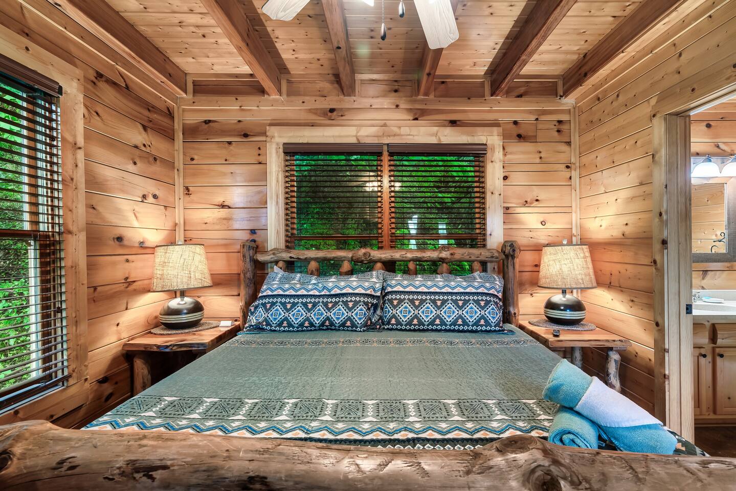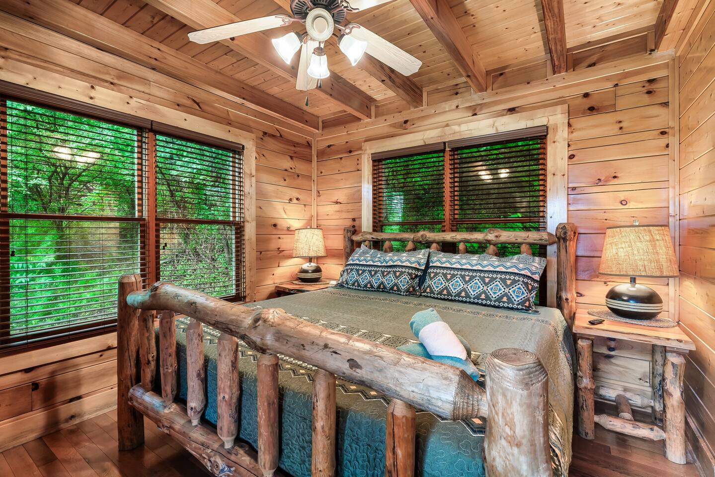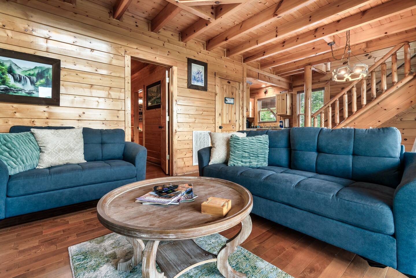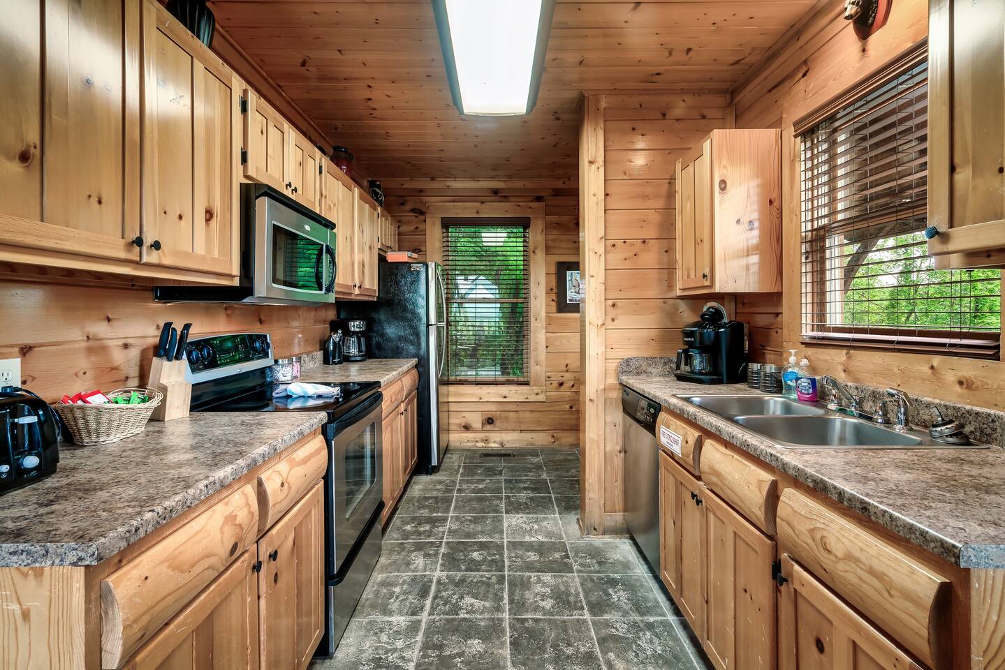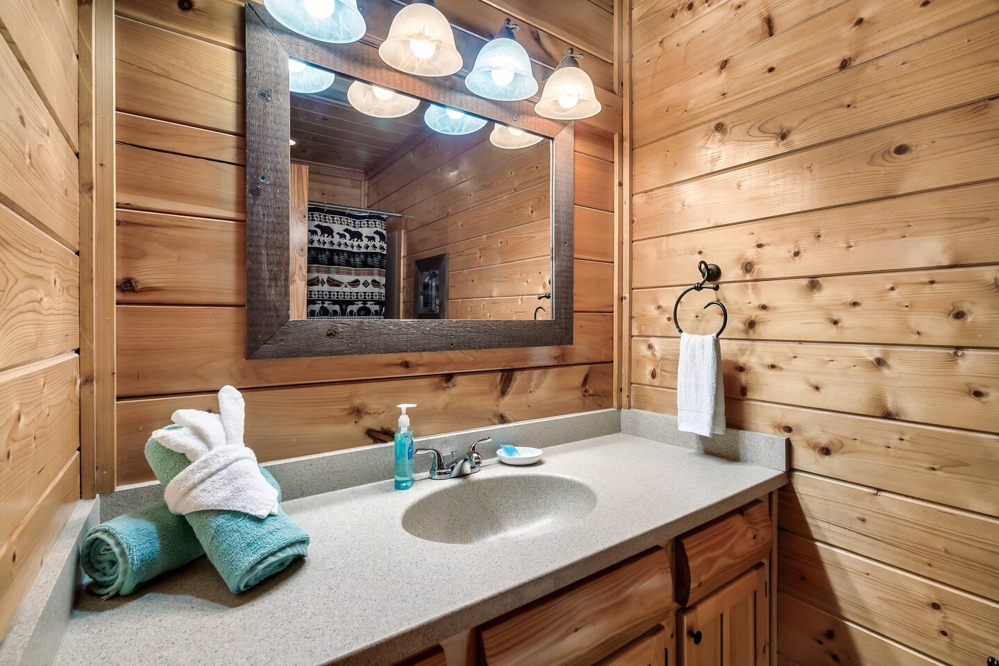 Make your way inside the idyllic log cabin using the keyless smart lock and be greeted with two levels of modern Smokey Mountain style and design perfect for couples, small families or for a romantic getaway. The living space features a bright open-plan layout and is filled with soft leather sofas that surround the inviting fireplace and wall mounted TV – perfect for a movie night in. Open up the glass door off the living space and step out onto your own private balcony where you can sit and enjoy your morning coffee, do a morning yoga session or just breathe in the fresh mountain air. Step through into the galley style kitchen that comes fully equipped with everything you could need to cook up breakfast, lunch and dinner with sleek stone benchtops and stainless steel appliances. There is a full-size fridge/freezer, a freestanding oven and cooktop, a microwave, coffee maker and a dishwasher to take care of all the cleaning up. Eat together at the dining table set for four or if you don’t feel like cooking, head out to the Parkway where you are spoilt for choice with plenty of restaurants, coffee shops and cafes to choose from just 10 minutes away in beautiful Pigeon Forge. Wake surrounded by nature in the luxuriously large king bed topped with soft linen and bedding along with a wall mounted TV and plenty of space for you to unpack and make yourself at home. Off the bedroom is the ensuite bathroom with a relaxing full size bath, an overhead shower and a vanity stocked with all the essentials. Take the stairs up to the second level of the cabin where you will find vaulted ceilings, an additional living space and a spacious games area with a full size pool table and even more awe inspiring views with floor to ceiling windows surrounding the space. Sit by the bar table with a drink or two while you shoot pool with friends or just relax with a book on the sofa in this quiet elevated space. Also on the second level is a full bathroom with a jacuzzi bath, a shower and a vanity stocked with plenty of soft fluffy towels and an additional small sleeper sofa. After a day exploring the Smokies, step out onto the upper deck with its spectacular views and slide into the warm hot tub while it soothes your tired muscles. Included with your stay is full use of the mountain resort amenities. Make your way up to the seasonal pool and cool off in the inviting water in summer then warm up in the sauna and fit in a workout with a fitness center in the clubhouse, it’s like a health retreat right on your doorstep. So if you are looking to enjoy the peace and quiet this private resort provides, look no further than this spacious, modern cabin with beautiful mountain views for your next getaway to Pigeon Forge. We can’t wait to welcome you! 🎉 Our Family is Holiday Friendly. During October [Halloween], November [Thanksgiving], and December [Christmas] you will very likely have decorations. ℹ️ Resort Pool/Pavilion Season is normally Memorial Day through Labor Day, please confirm with us if these amenities are important to your stay as they are not guaranteed.